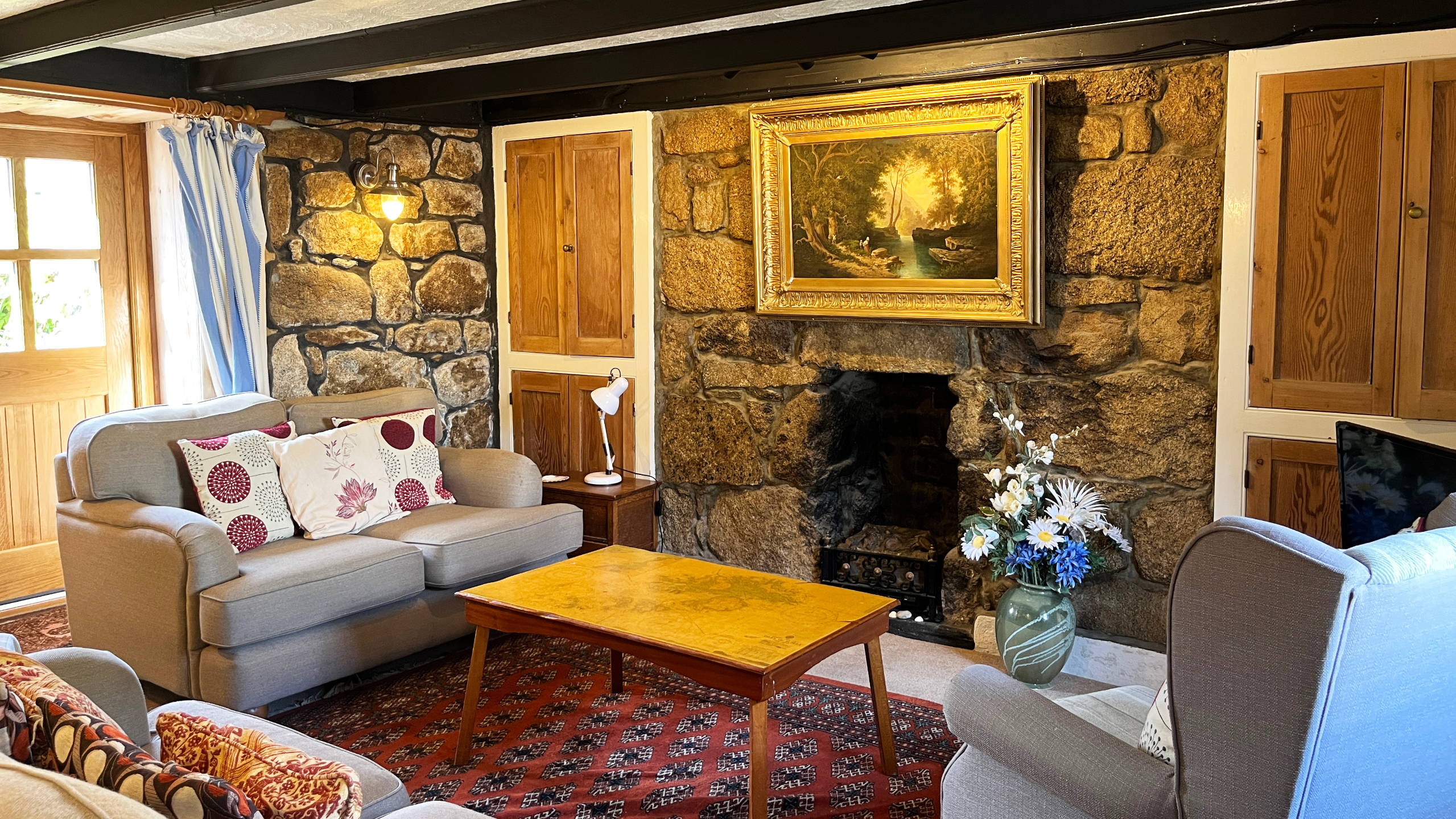 Traditional style room with 6 pained sash window to the front, black beamed ceiling, exposed granite walls, open fireplace (not operational) with electric fire, recessed wall cupboards and half glazed oak door to the rear garden.