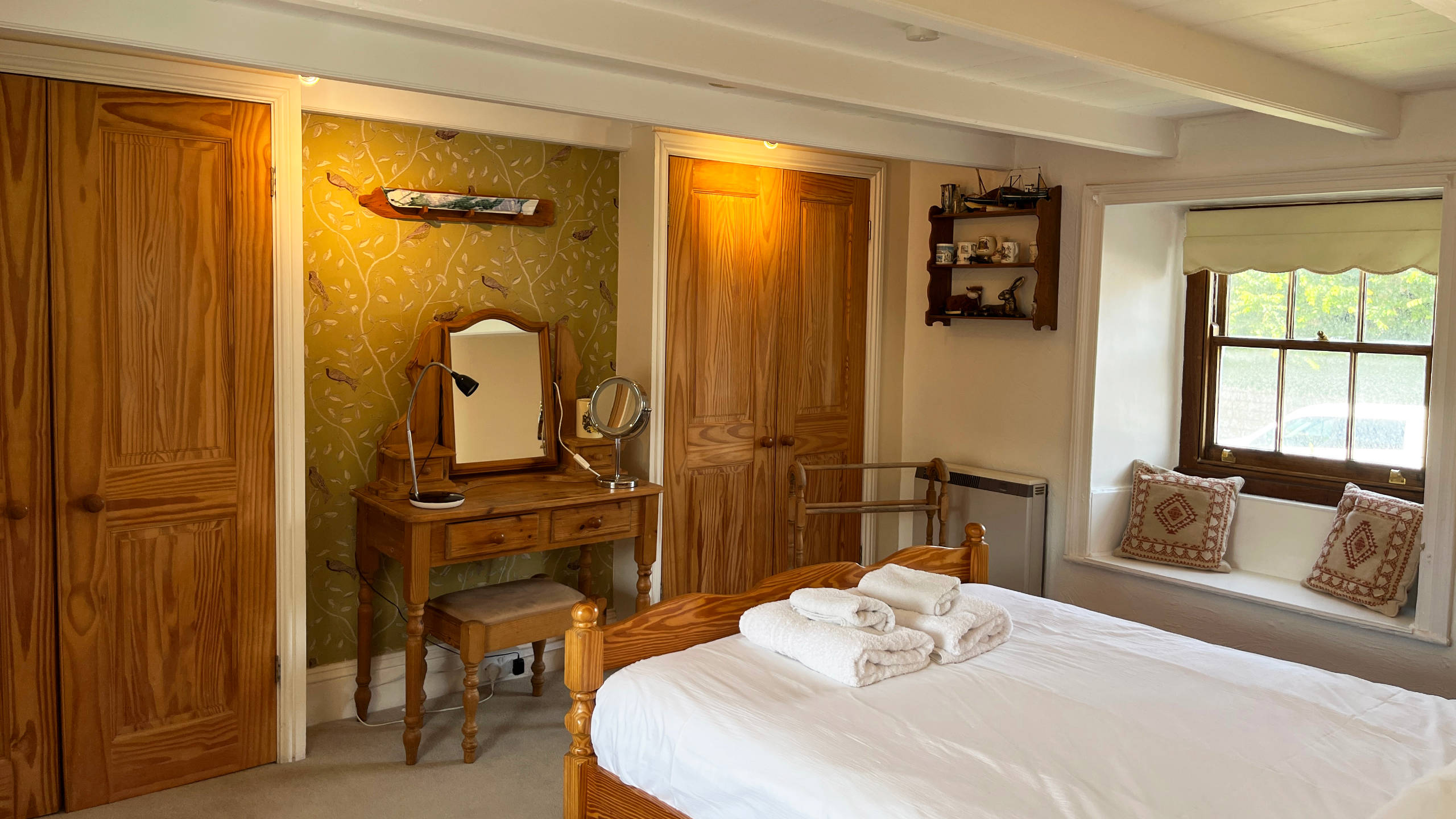 Double bedded room with recessed full height cupboards, dressing table, night storage heater and sash window to the front garden and UPVS window to the rear garden. Fully carpeted floor with a beamed ceiling.