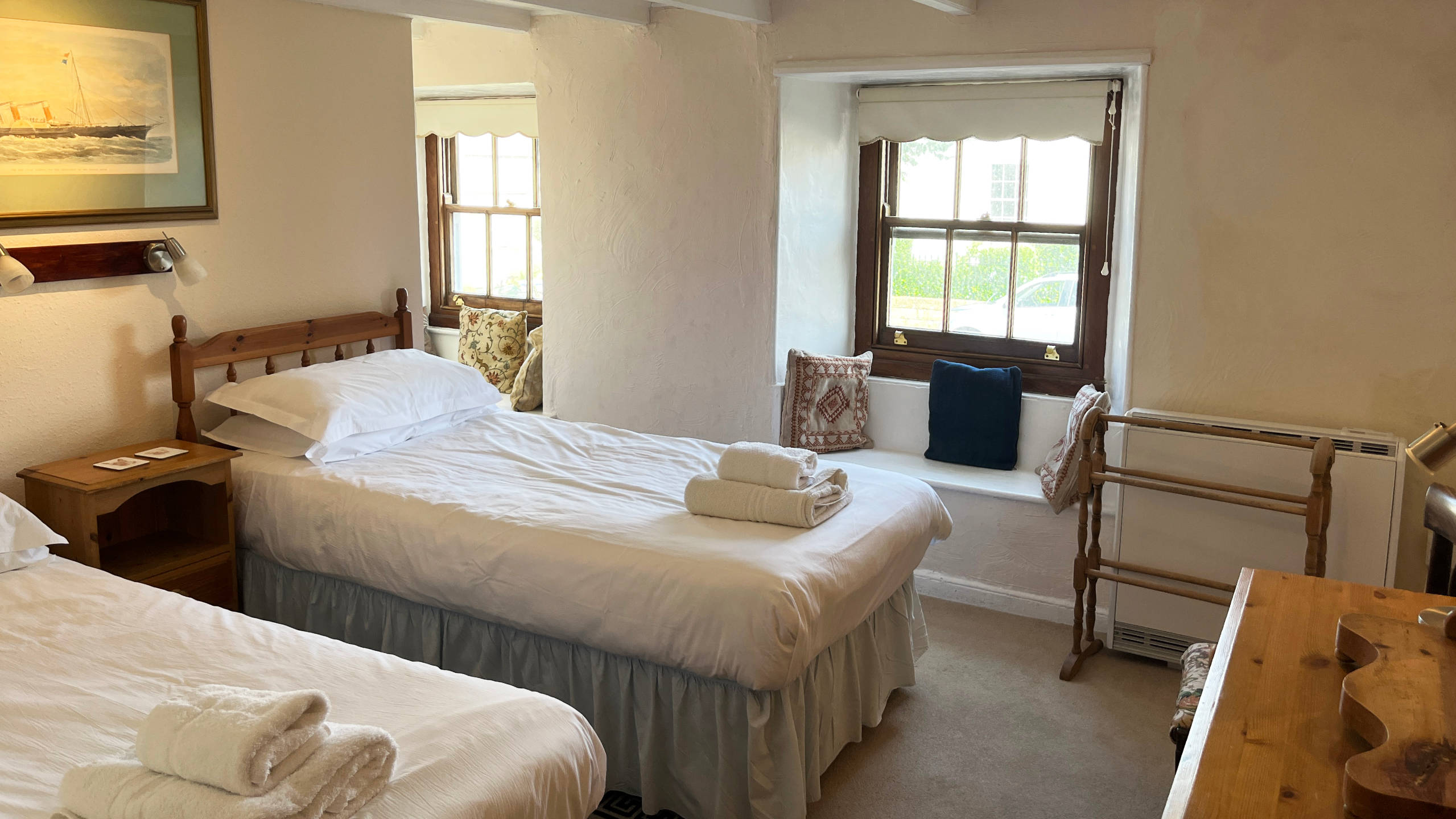 A twin bedded room with recessed cupboard, two sash windows to the front garden. Night storage heater, wardrobe, fully carpeted floor with a beamed ceiling.