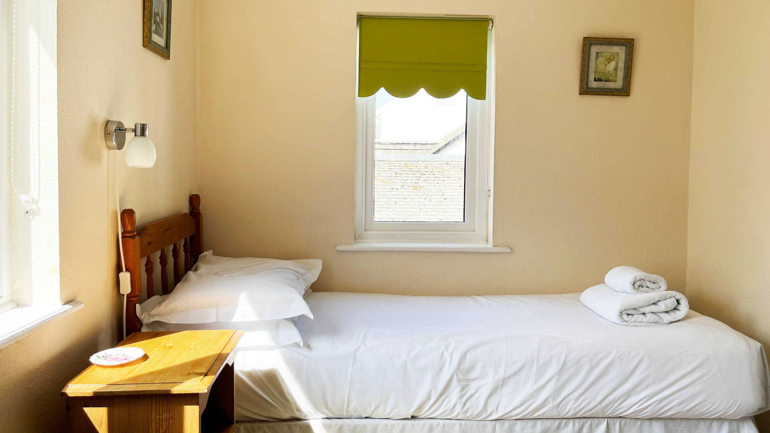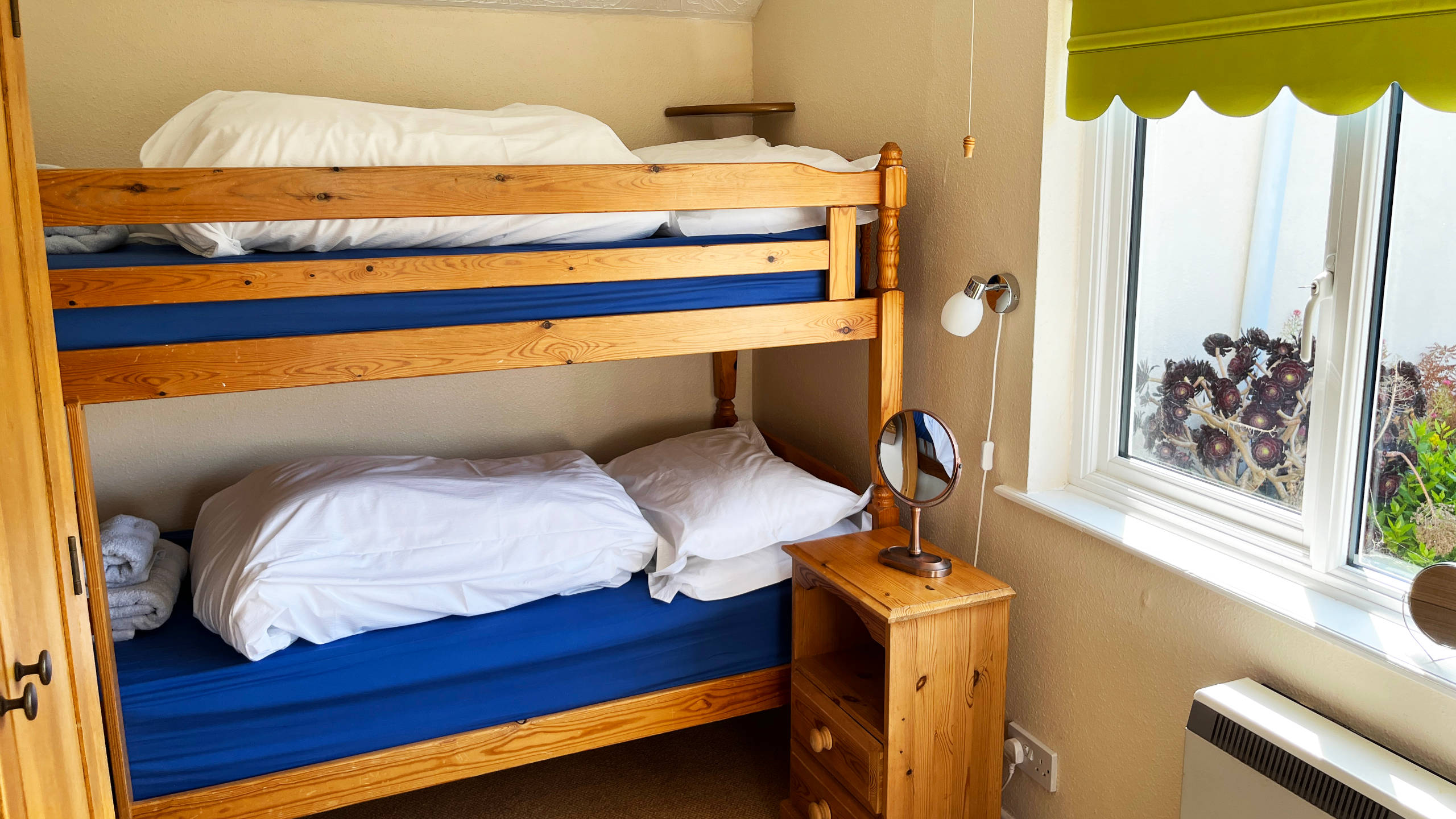 Carpeted, dual aspect windows overlooking the rear garden, One pine bunk bed and one pine single bed, electric night storage heater bedside cabinet, small desk and wardrobe.