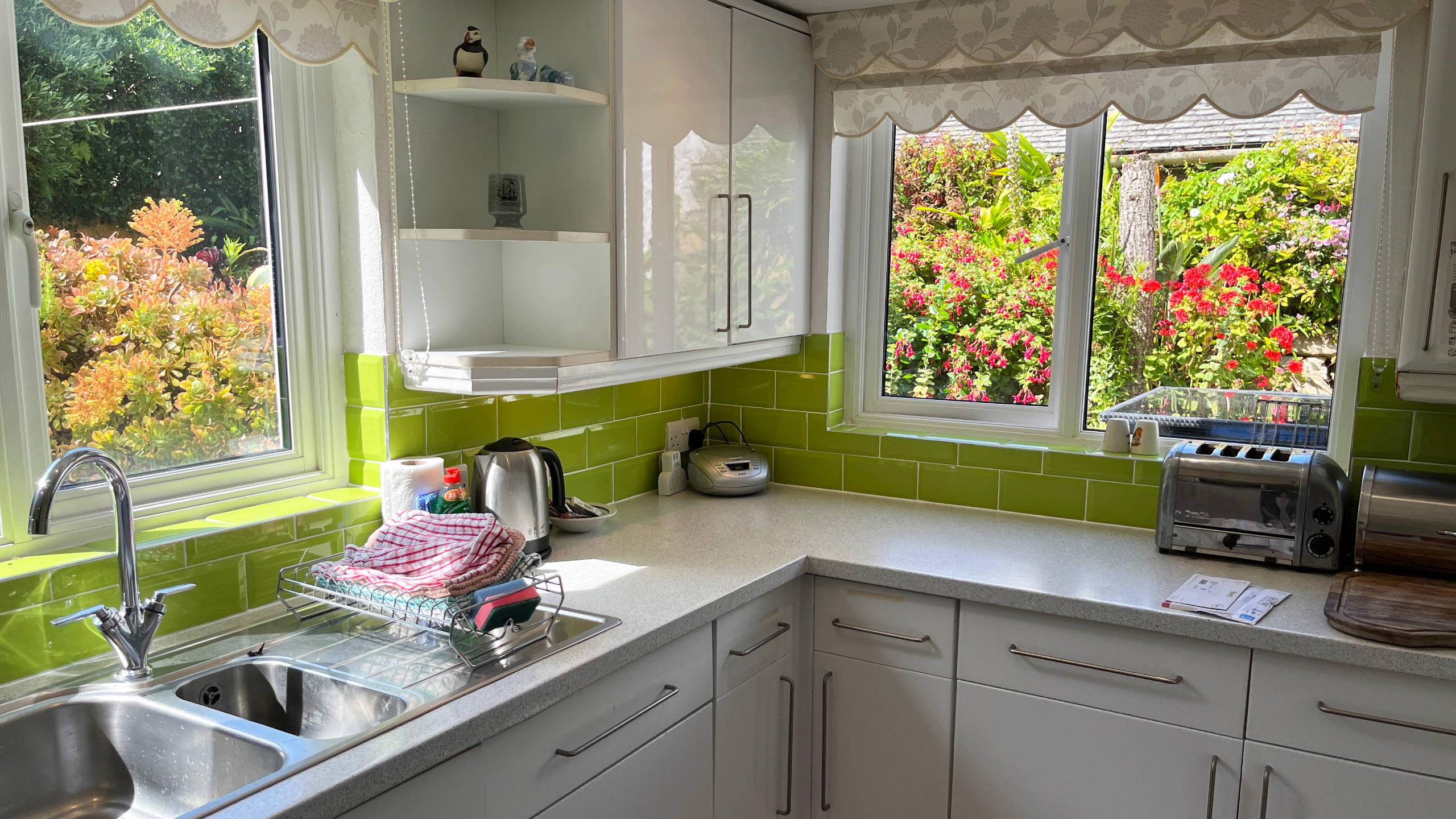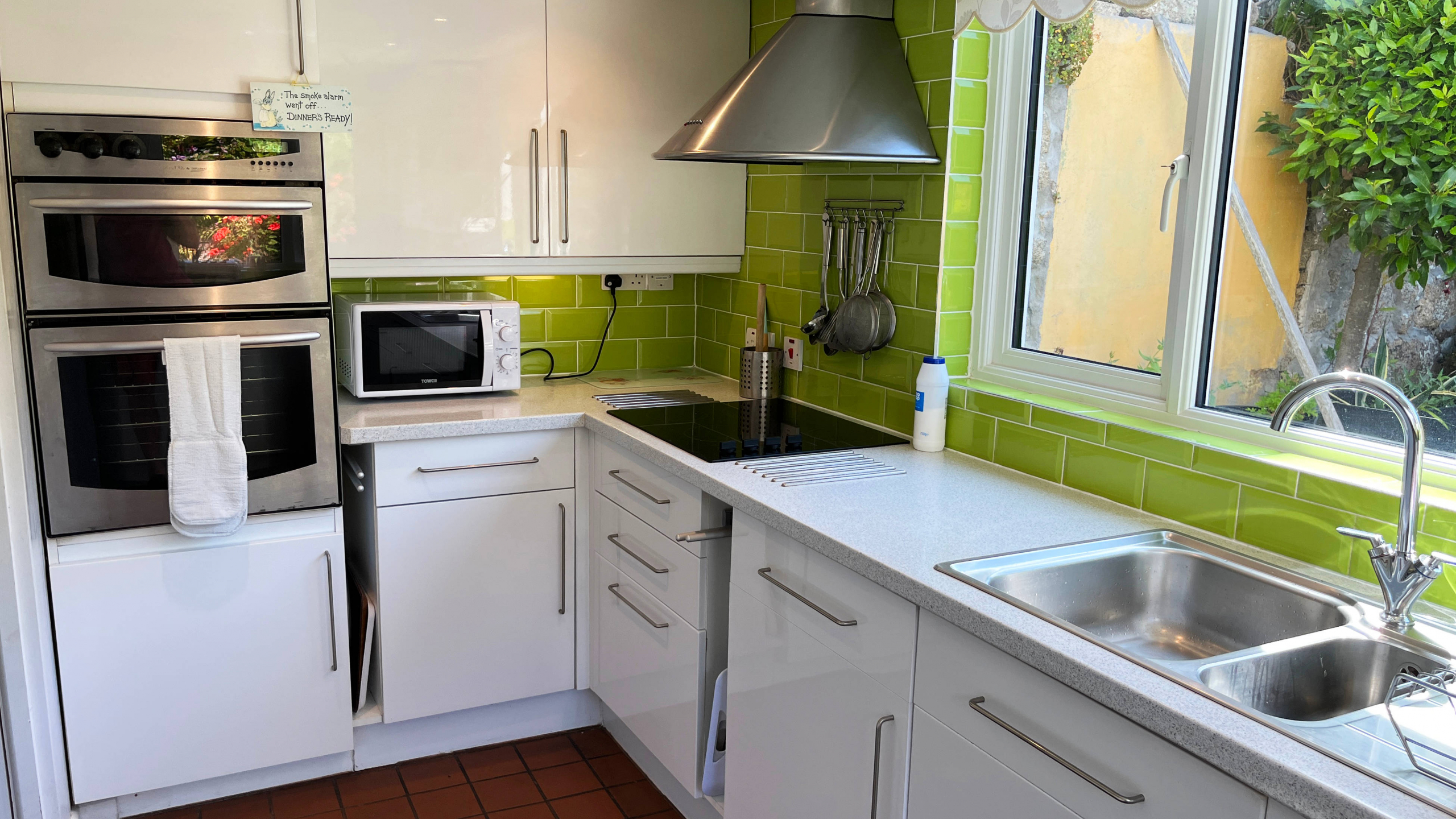 Quarry tiled floor and partially tiled walls, full fitted kitchen, inset oven, fridge freezer, wall cupboards, ceramic hob with extractor over, single drawer sink unit, double glazed dual aspect windows over looking the rear garden.