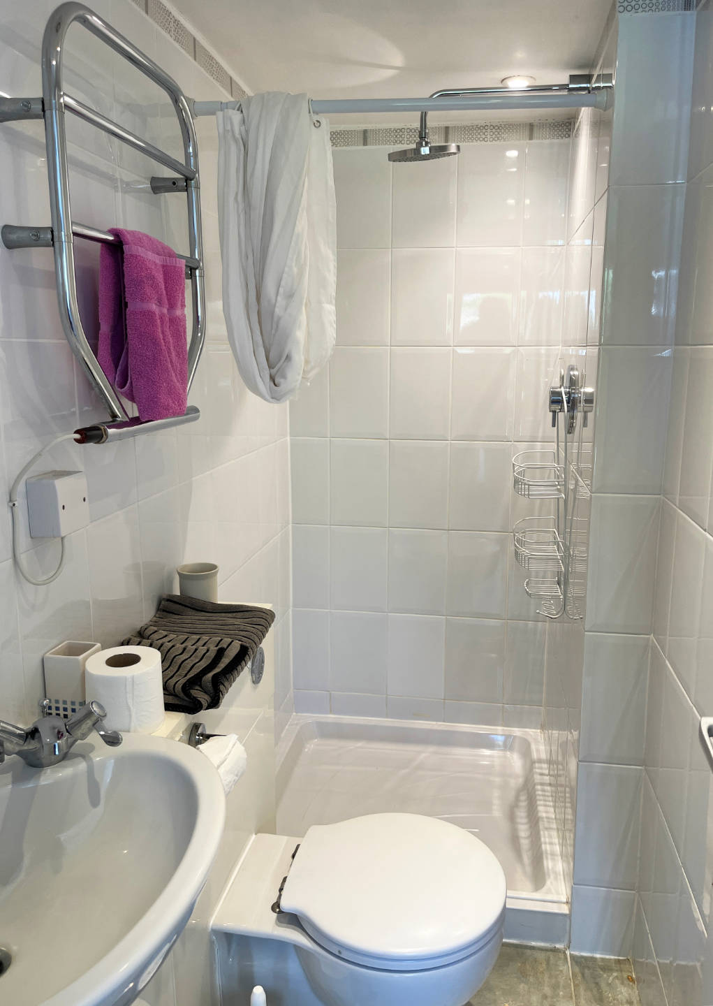 Fully tiled room with shower cubicle with rainwater style shower head over, close coupled WC, hand basin and heated towel rail.