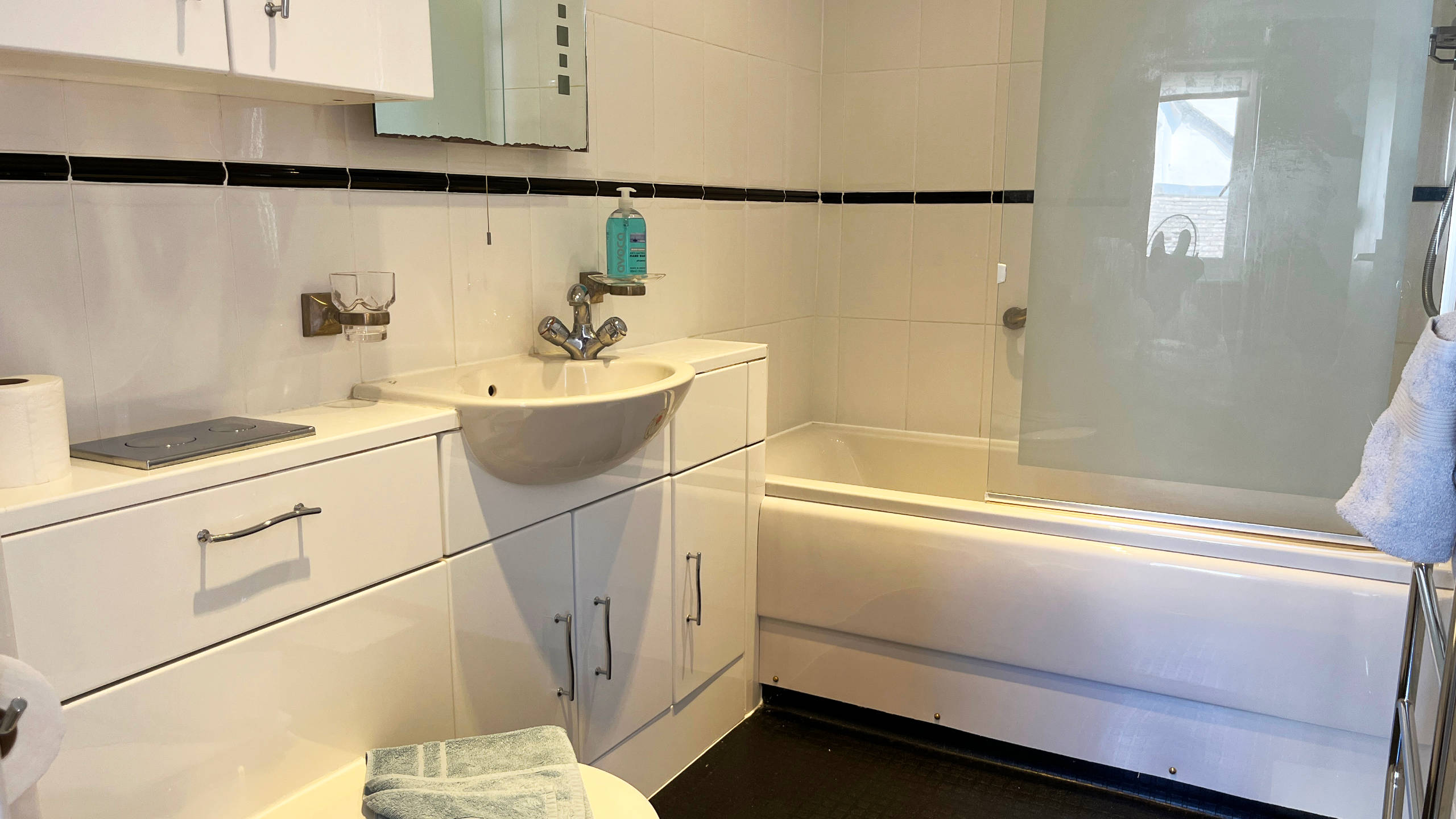Fully tiled room with bath and overhead shower, close coupled WC, hand basin, bathroom cabinets, mirror and heated towel rail.
